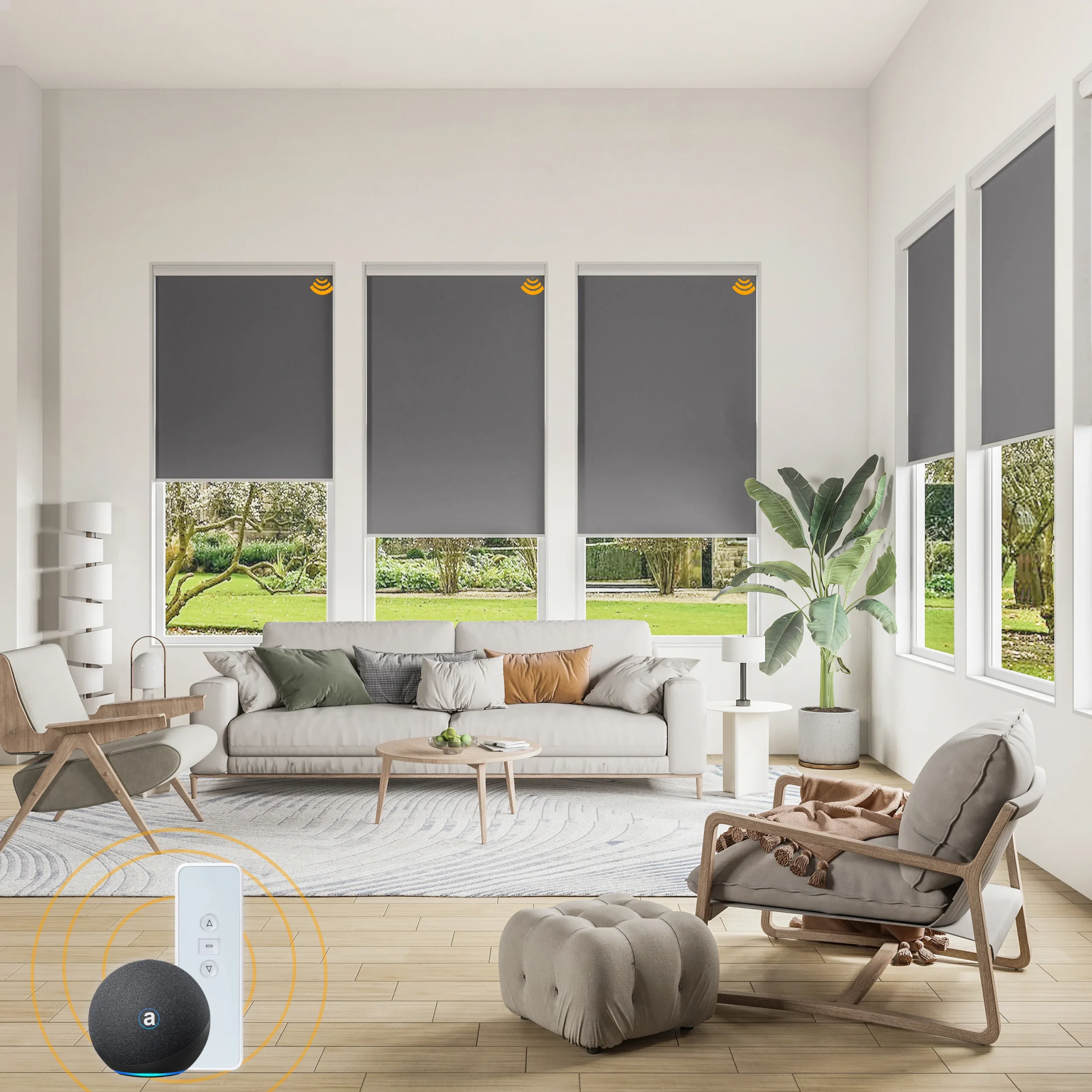 Control your shades instantly with a remote, wall switch, or smartphone app — no cords, no hassle.